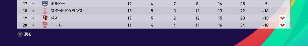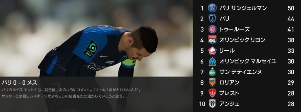 20節のパリSG戦で大勝利を挙げたパリFCは、その後のCoup de France3回戦で敗北、そして今節のメス戦でもドローに終わり勝ちから見放されています。首位パリSGと一時は4ポイント差まで近づくも再び6ポイント差まで離されました。