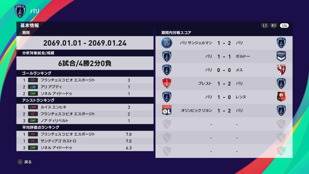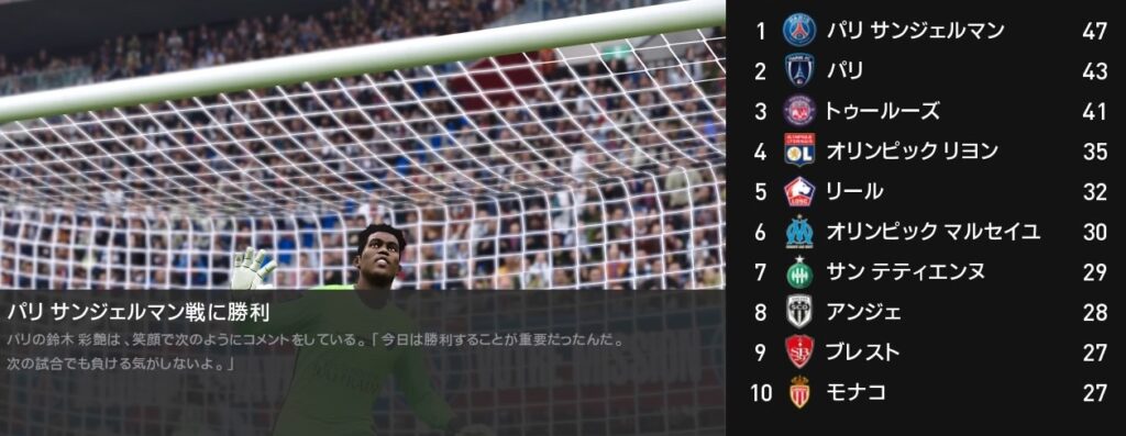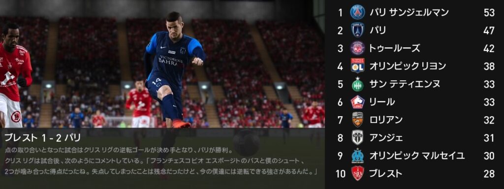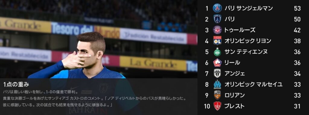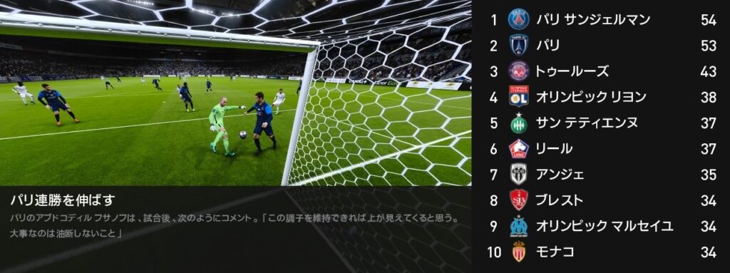 強敵リヨンに競り勝ったパリFCはリーグ戦3連勝、そして首位パリSGとの差は1ポイントにまで迫りました。この試合の主役はピオ・エスポージトです。圧倒的な決定力が試合を決めました。プレーにムラがあるピオ・エスポージトですがこの日は完全にハマりました。首位奪還も目前なので次節リール戦へ集中しましょう。