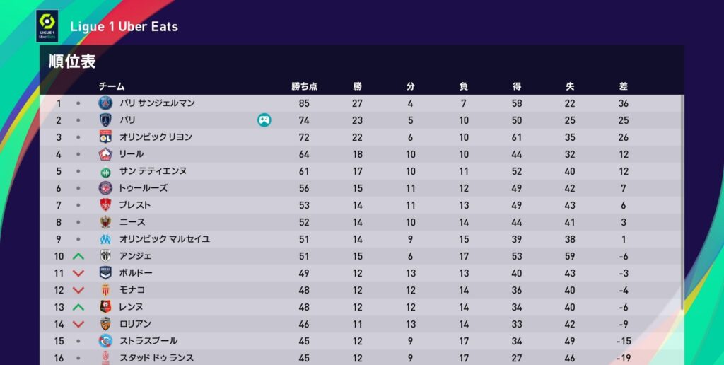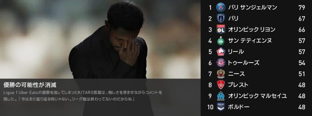 33節ロリアン戦は0-1で惜敗です。この敗北はパリFCにとって痛恨の結果であり、首位との差が11ポイントにまで広がってしまいました。