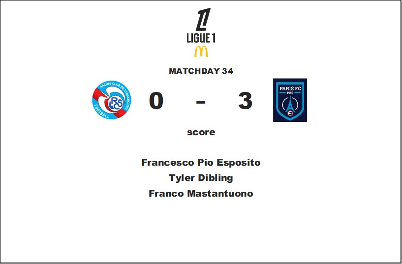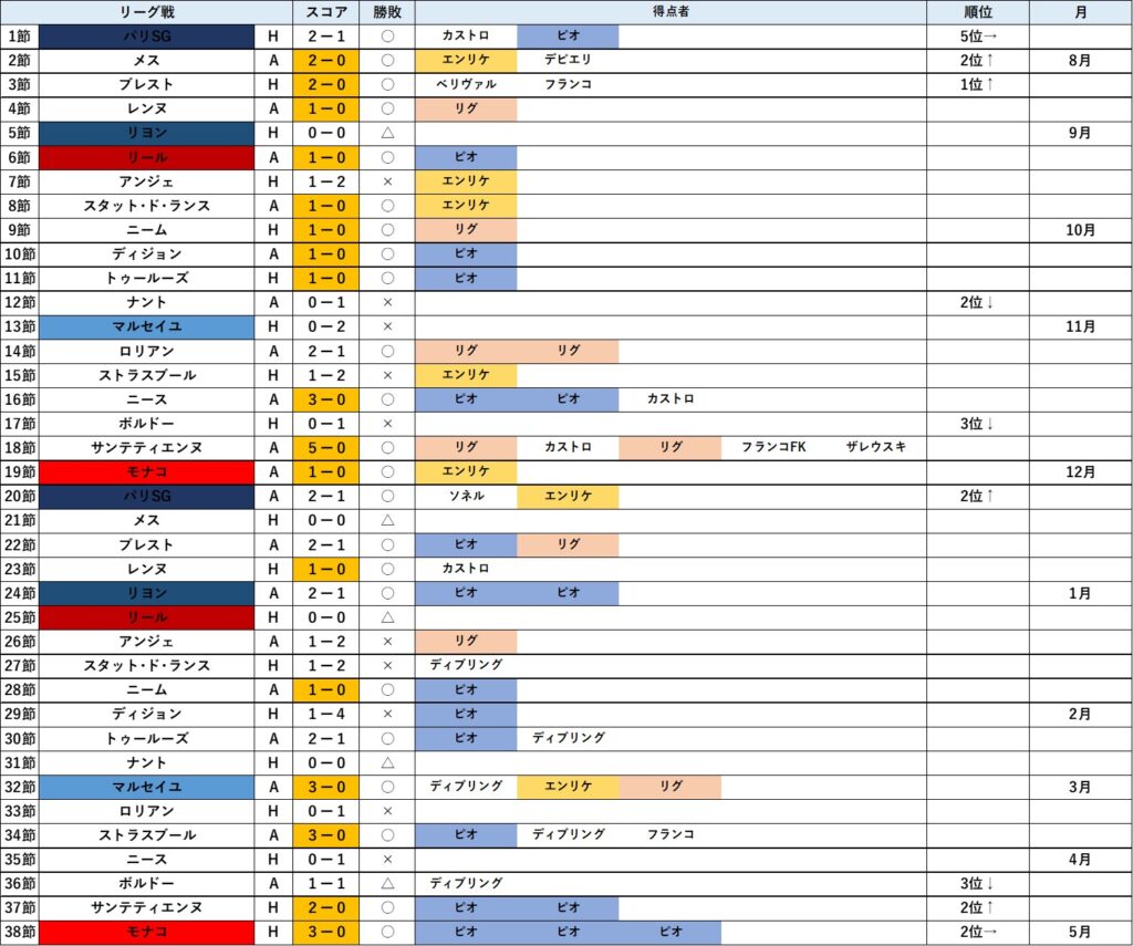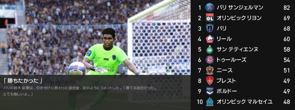 34節ストラスブール戦はピオ・エスポージト、ディブリング、マスタントゥオーノのゴールで快勝を収めました。3位リヨンも勝っているためその差は4のまま。現実的な考えから2位を死守することが先決のようです。