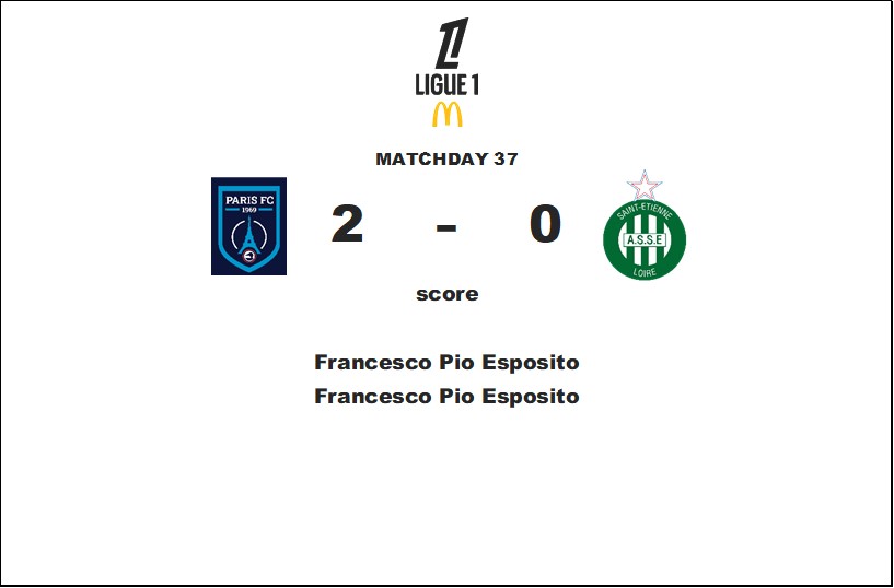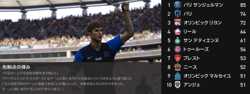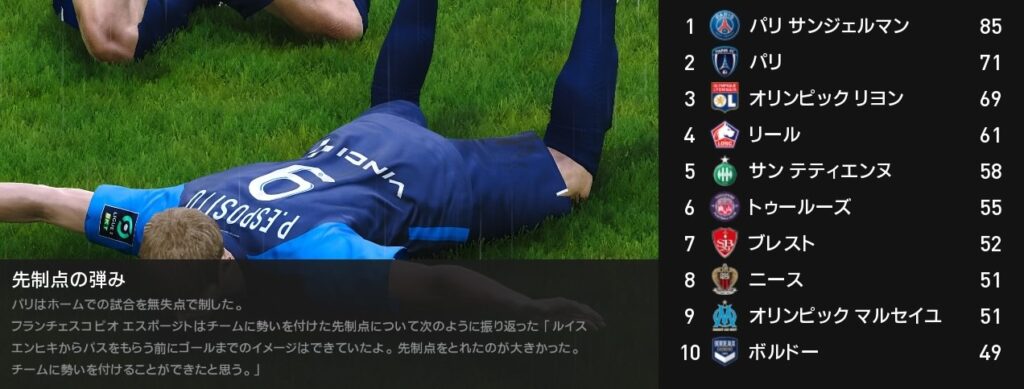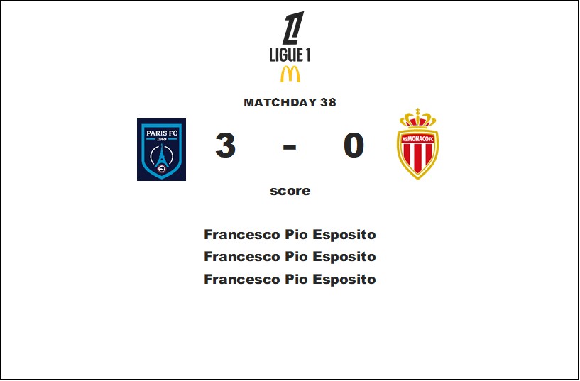 シーズン最終戦はピオ・エスポージトが圧巻のパフォーマンスを見せハットトリックを達成しました。3-0でモナコを粉砕した結果、パリFCの2位が確定します。即ちCL出場権を獲得しました。