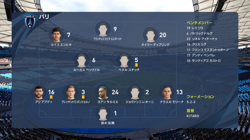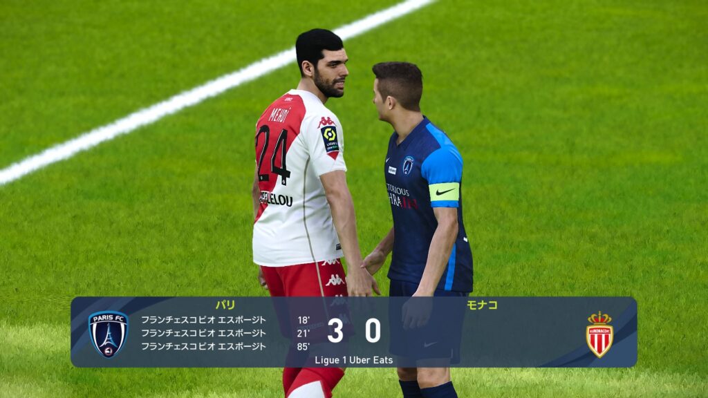 前節の勝利で再び2位に浮上したパリFCは、最終節モナコ戦に挑みます。スタメンは現状のベストメンバーを起用しています。相手は強豪モナコ。ベン・イェデル、ヤヌザイ、チュアメニなど警戒すべき選手が多いですが、パリFCにとっては勝利以外求めていません。シーズン2位を死守すべく戦います。