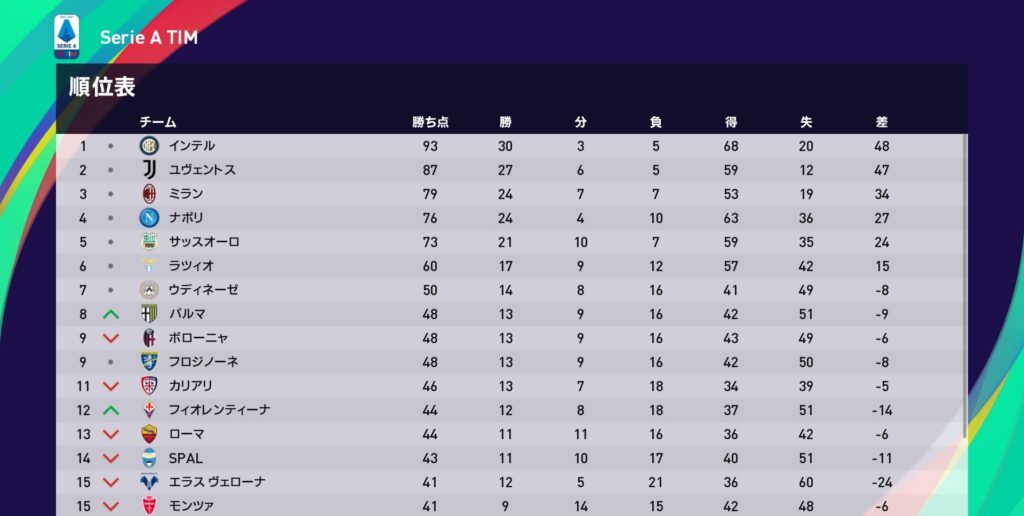 インテルが2年ぶり15度目のスクデットを獲得しました。それでもユヴェントスの最多優勝回数の半分です。BIG3が上位を占めたのは久しぶりに見たかもしれません。そして中堅の星アタランタがセリエB降格が決まりました。