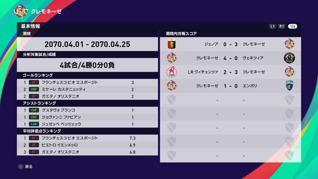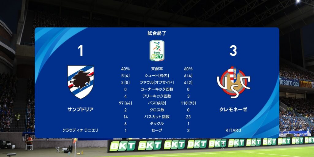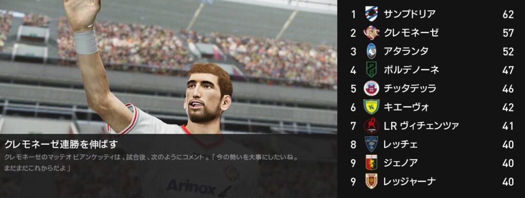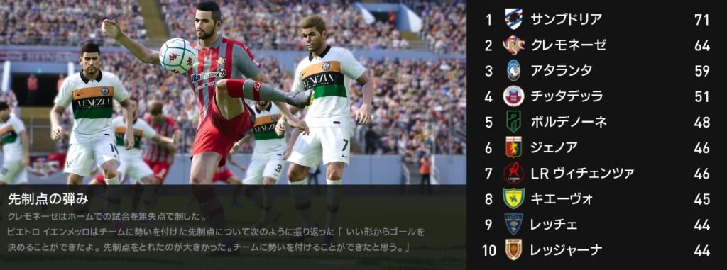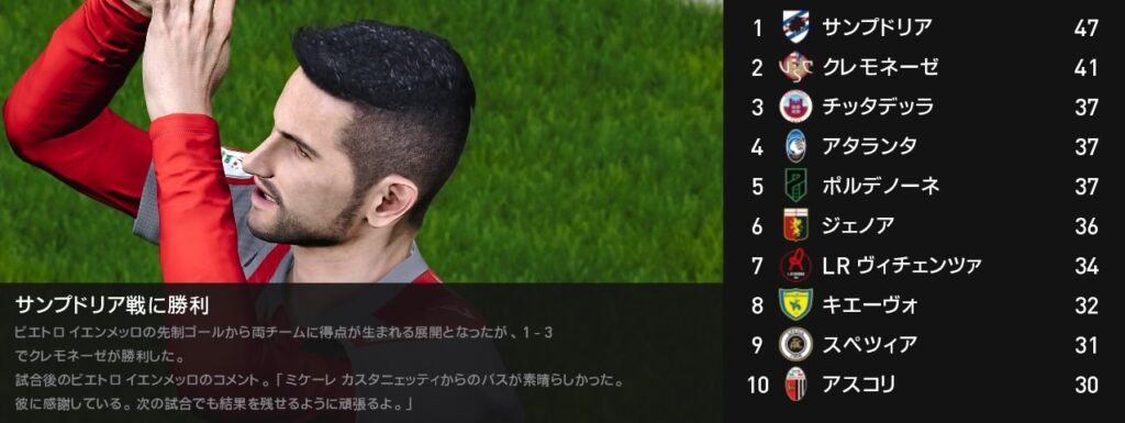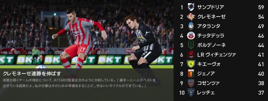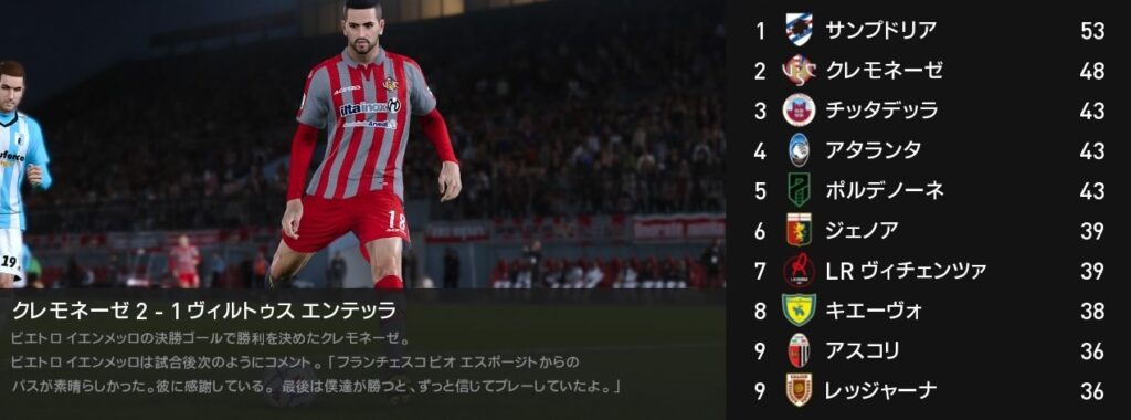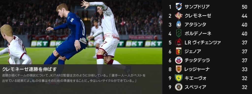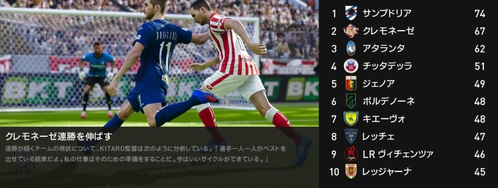 今月は4戦全勝でサンプドリアを猛追しました…が、背中は未だに遠く見えません。残り5試合を全勝しても逆転出来るかは厳しい状況下です。ですが可能性が続くまで諦めずに戦って先ずは昇格を決めましょう。