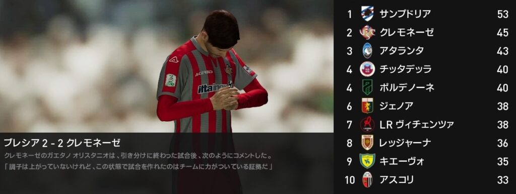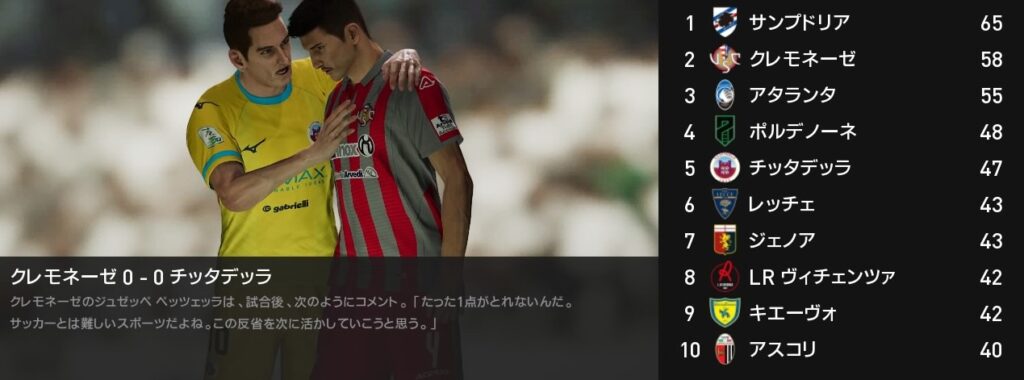 今節は5位チッタデッラとの一戦です。ザニオーロ率いるチッタデッラ相手に牙城を崩す事が出来ずにスコアレスドロー…。負けてはいないものの今の状況からするとあまりにも痛すぎる引分けです。サンプドリアとの差は7ポイントに広がりました。
