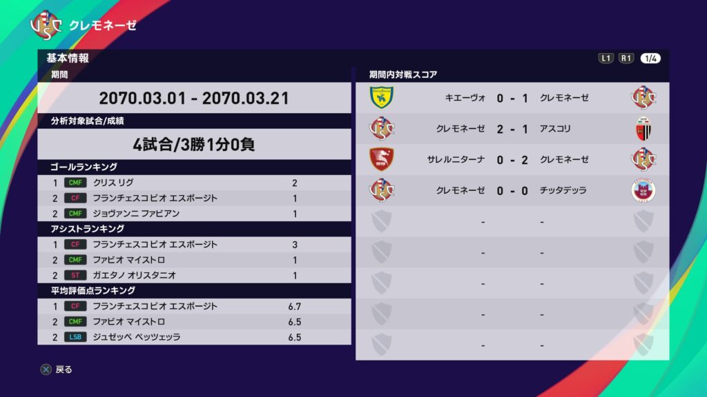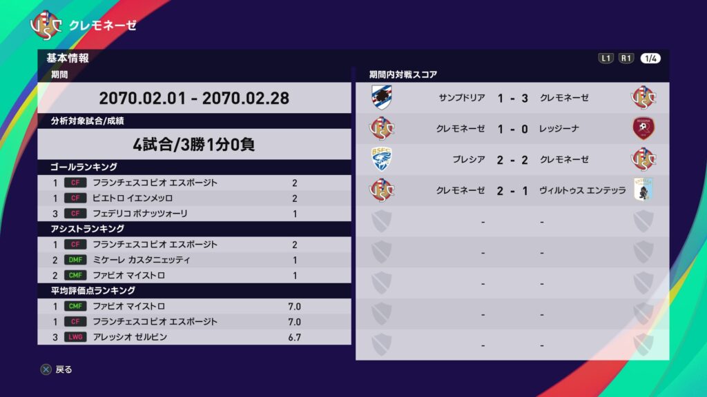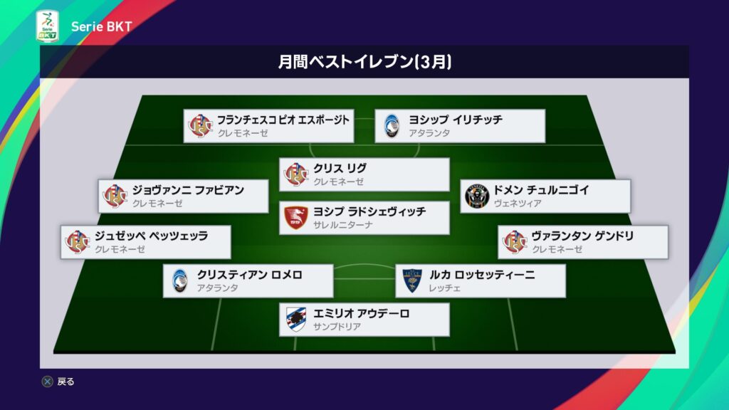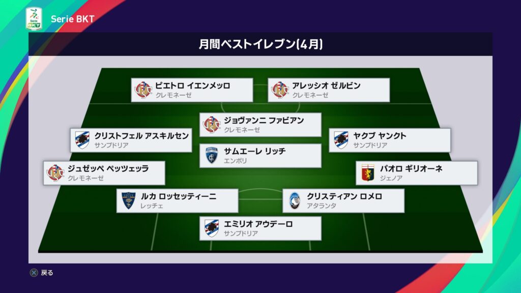 今月は5選手が選出されましたがやはりチッタデッラ戦の引き分けが悔やまれます。それとピオ・エスポージトの3アシストは素晴らしいですね。ゴールとアシストを両立出来る選手は珍しいので…。