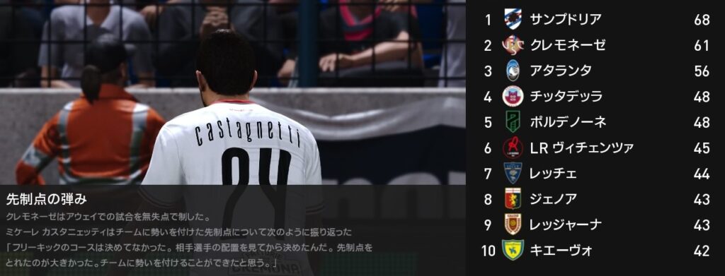 30節ジェノア戦はカスタニェッティの直接FK2発を含む3得点で快勝しました。貴重なフリーキッカーがチームに居ることは大きな武器です。