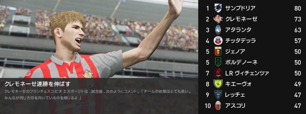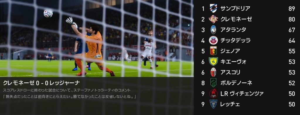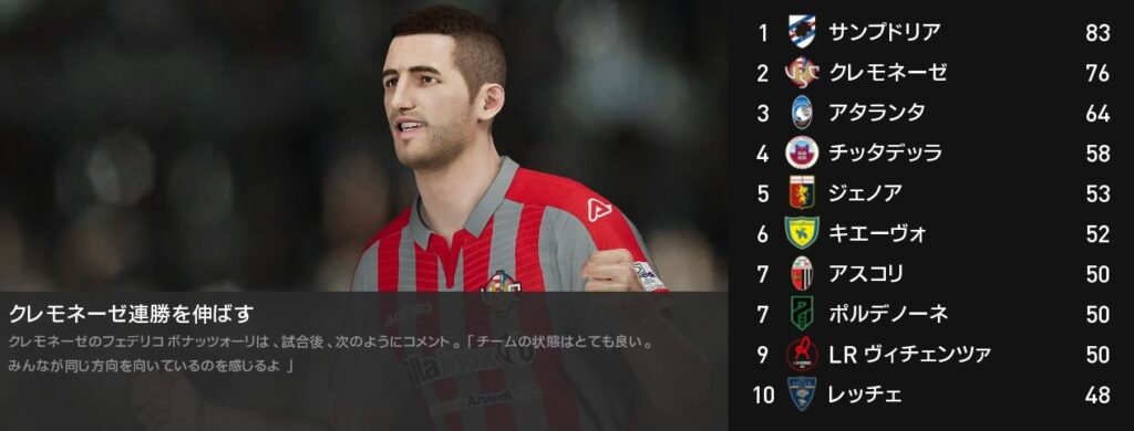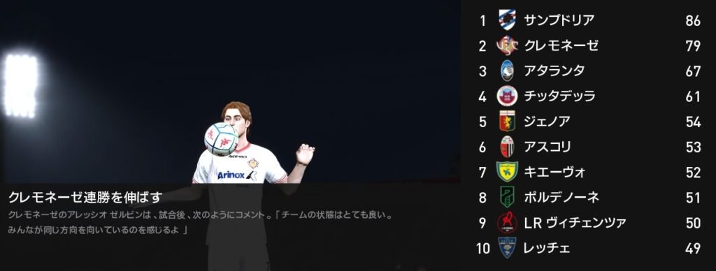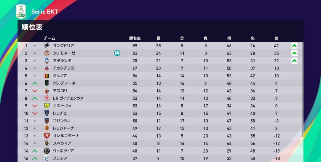 今節クロトーネ戦で勝利を挙げたクレモネーゼですが、この時点でサンプドリアのリーグ優勝が決まりました。チーム最大の目標だったセリエB制覇は実りませんでしたが、残り2試合も勝ってシーズンを締めくくりましょう。