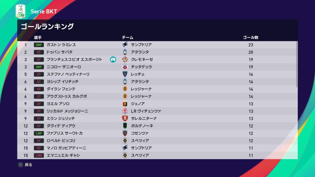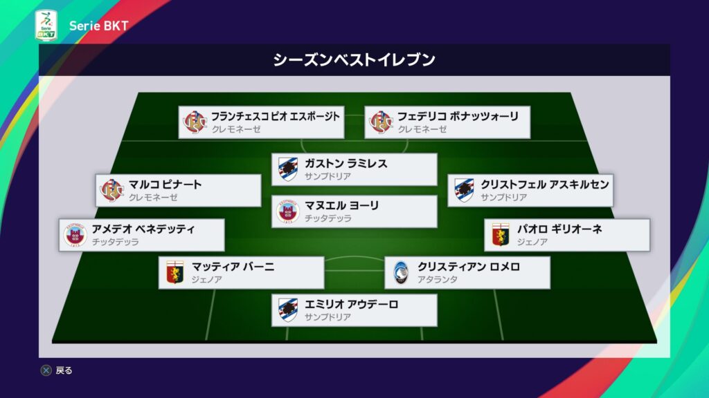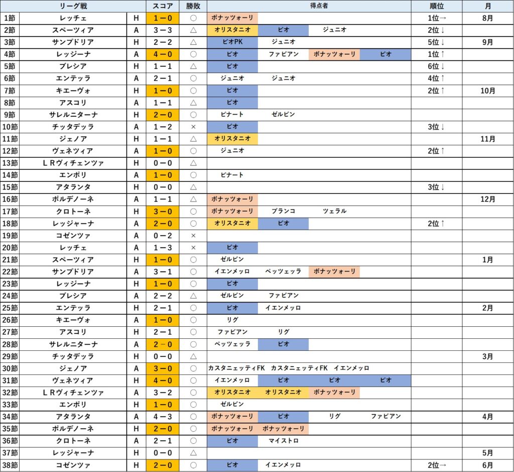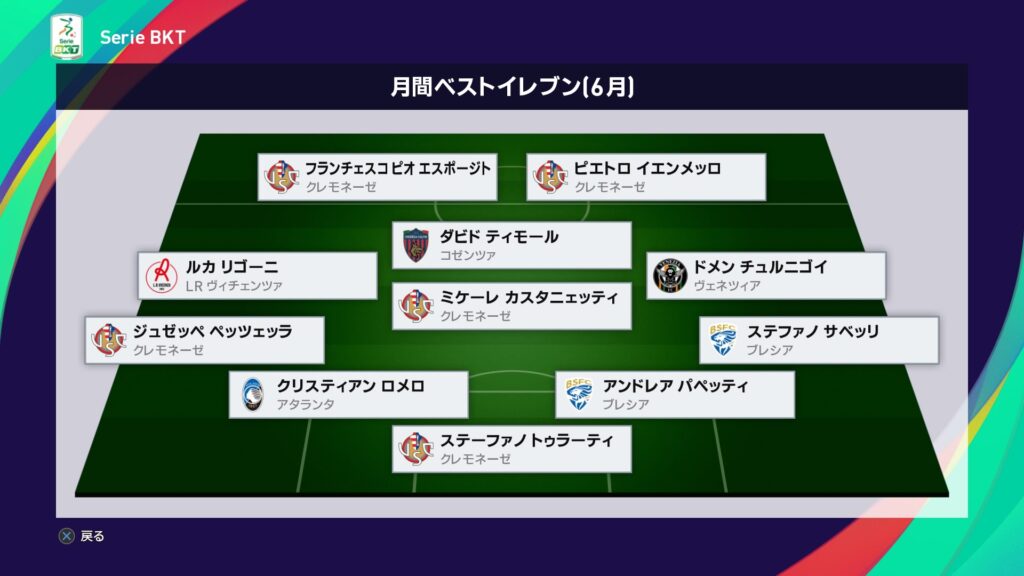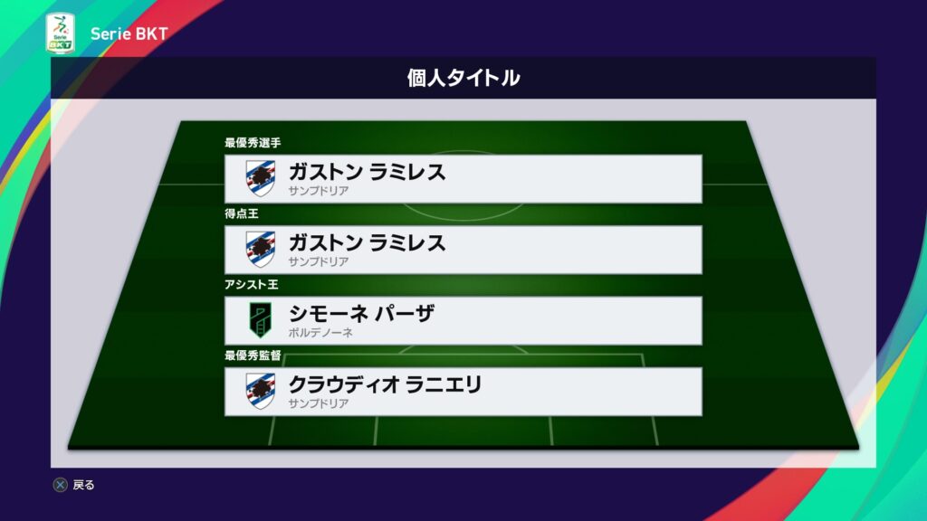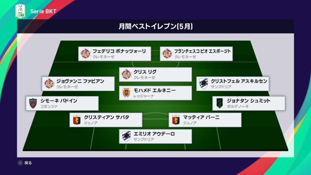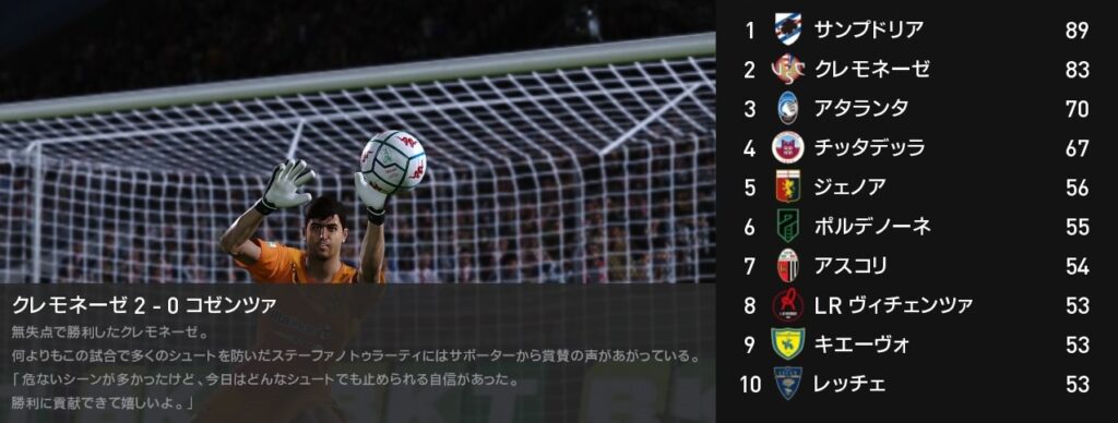 今月はアタランタ戦の大逆転勝利もあり昇格を決めた一方で、サンプドリアとの優勝争いに敗れた結果に終わりました。最低限のノルマは達成したので良しとしましょうか。