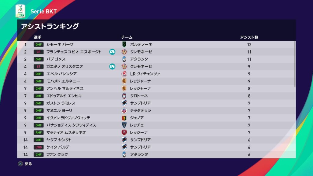 アシスト王にはポルデノーネからシモーネ・パーザだ選出されます。そして2位タイには11Aでピオ・エスポージトがランクインです。19得点11アシストはMVP級の活躍ですよね???