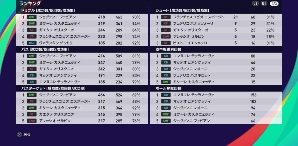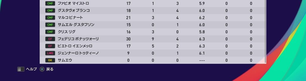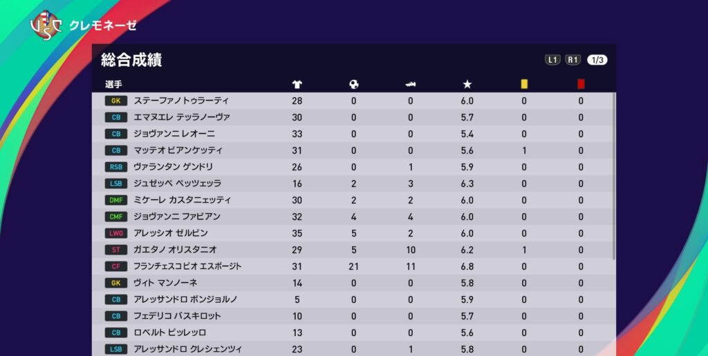 今季の守備面ではDFリーダーのテッラノーヴァの貢献度が群を抜いてます。まだ若く伸び代もありますが、同時に市場価格もある程度高いので適正なオファーが来れば検討せざるを得ないでしょう。司令塔のカスタニェッティも同じ事が言えます。