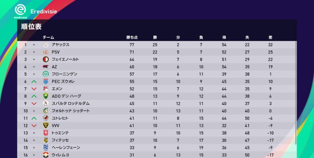 アヤックスがリーグ5連覇、通算19度目の優勝です。今季は上位3位を3強が占めて波乱のない順当な結果と言えるでしょう。初めに載せたCL・ELの歴代優勝クラブ一覧を見ても分かる通り、エールディヴィジからの優勝クラブは未だにありません。戦力的にはトルコやロシアのクラブよりは格段に上なはずなので今後の欧州カップにも期待しましょう。