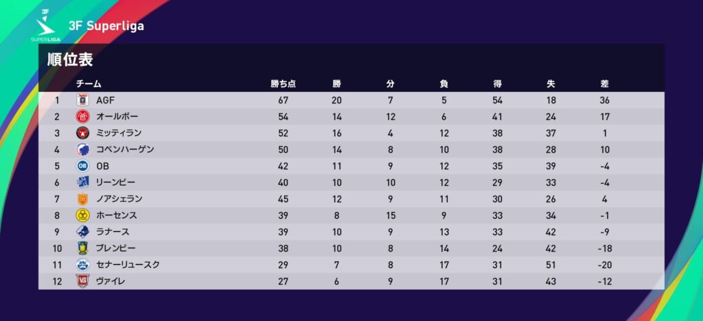 AGFが29年ぶり5度目のチャンピオンに輝きました。ビクトル・フィッシャーを中心に快進撃を見せたAGFは2位以降に大差を付けての優勝です。確かAGFには香川真司も在籍していたはずです。来季のCLが楽しみなクラブの一つですね。