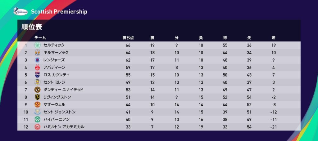 セルティックが3年ぶり27度目の優勝です。上位3チームの優勝争いは終盤まで見応えのあるもので、本来これがリーグの”あるべき姿”かも知れません。