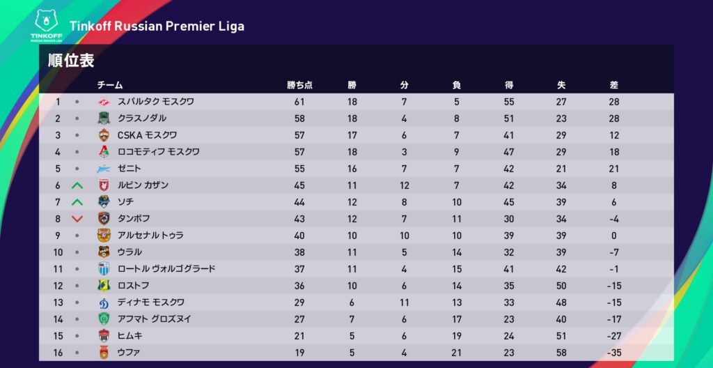 スパルタク・モスクワが6年ぶり13度目のリーグ優勝を成し遂げ、これはリーグ最多の回数を誇ります。今季のリーグ順位の上位5チームがロシアリーグの5強と言えるでしょう。